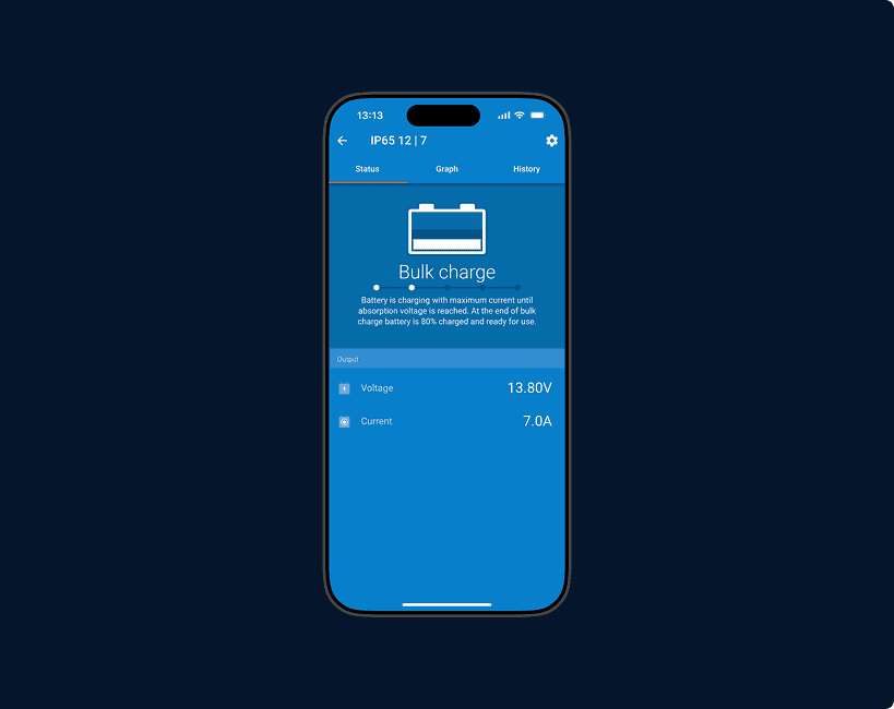 Met de gratis VictronConnect-app voor Android of iOS kunt u laadprofielen aanpassen, real-time status volgen en gebruiksgeschiedenis bekijken, zodat u de controle kunt houden zonder de lader aan te raken.