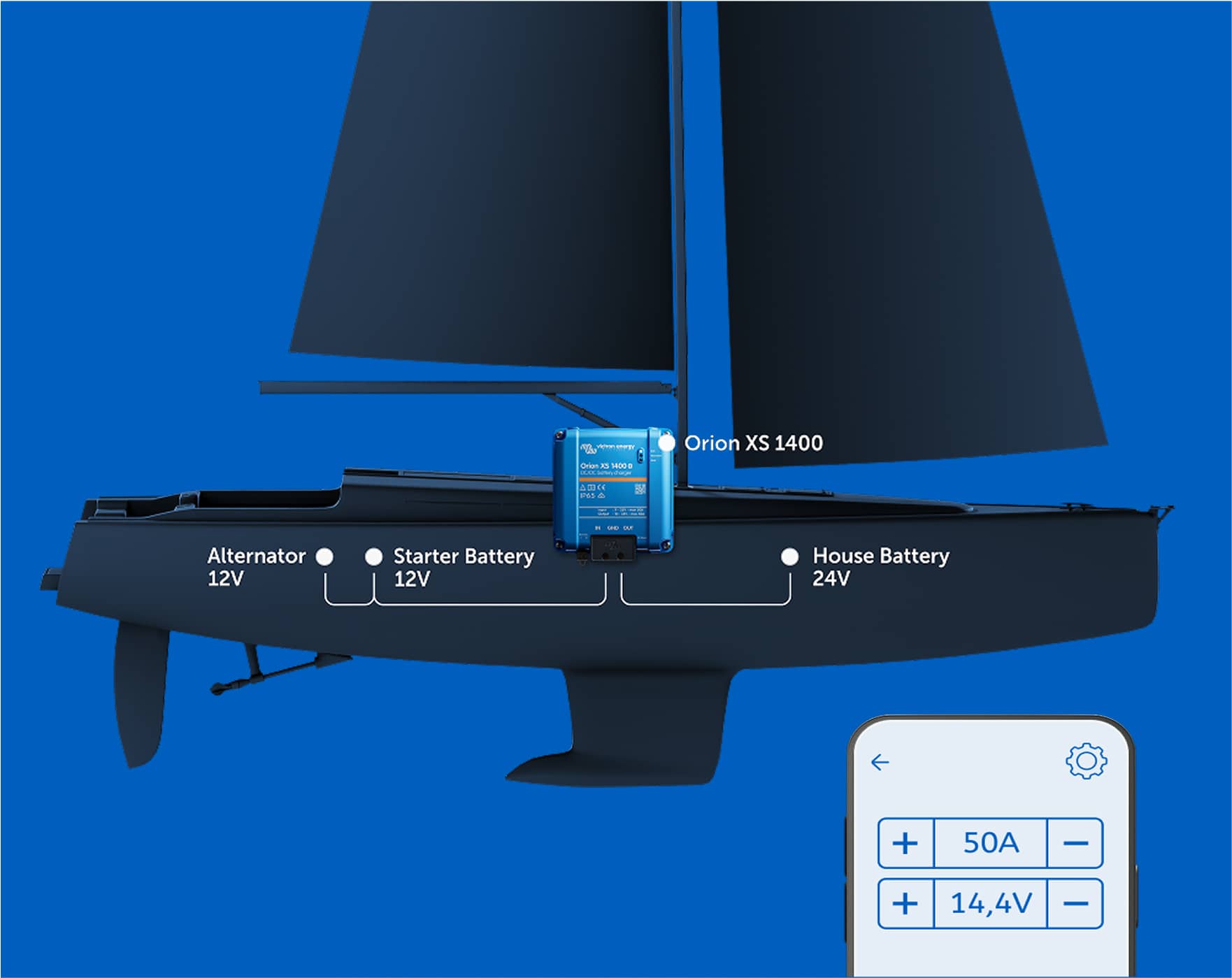 De ingangsstroom kan nauwkeurig worden beperkt om overbelasting van de dynamo te voorkomen. De laadspanning is volledig configureerbaar om overeen te komen met lithium-, AGM-, Gel- en andere accusamenstellingen. Voor systemen met gemengde spanningen biedt de Orion XS 1400 ook 12V naar 24V- of 24V naar 12V-conversie.